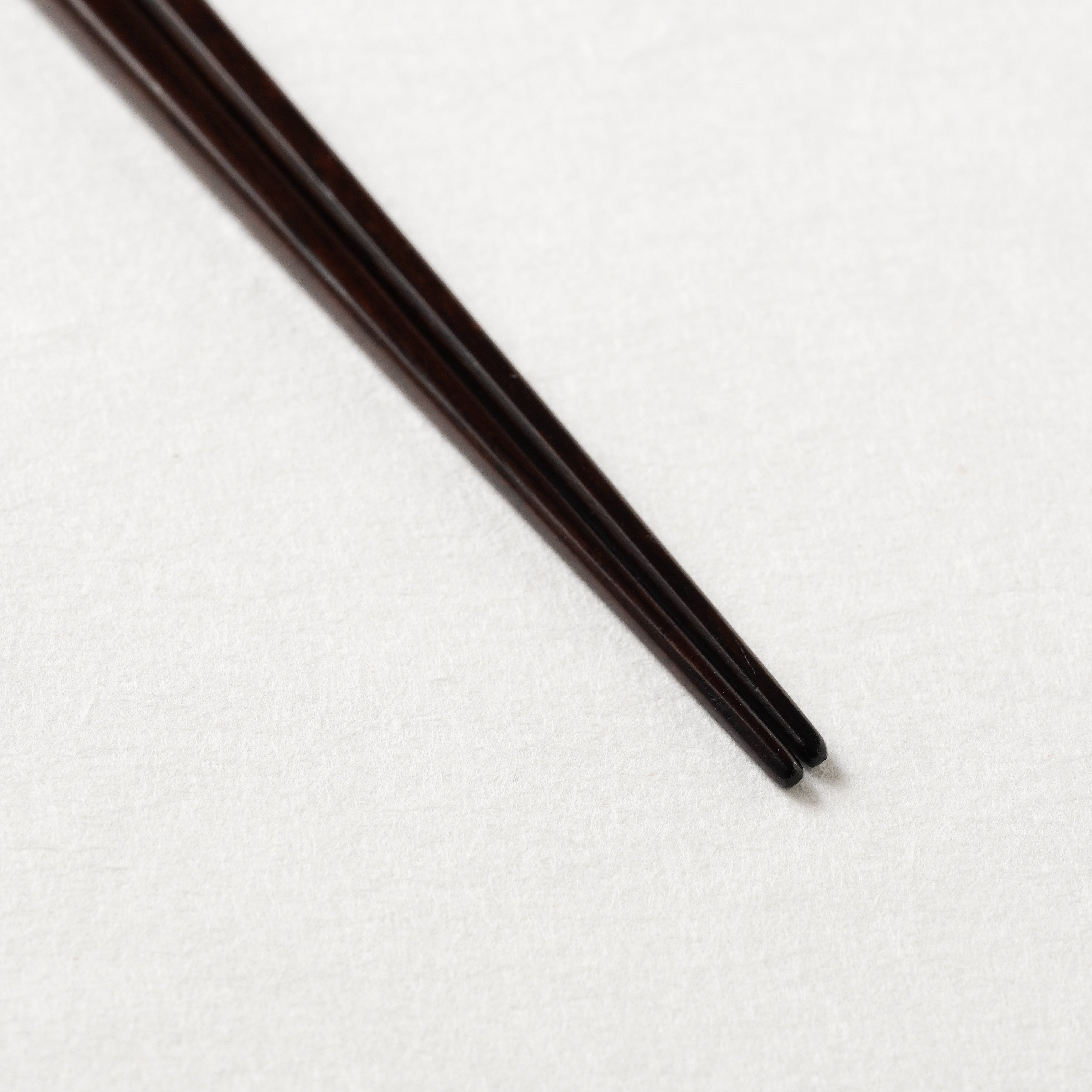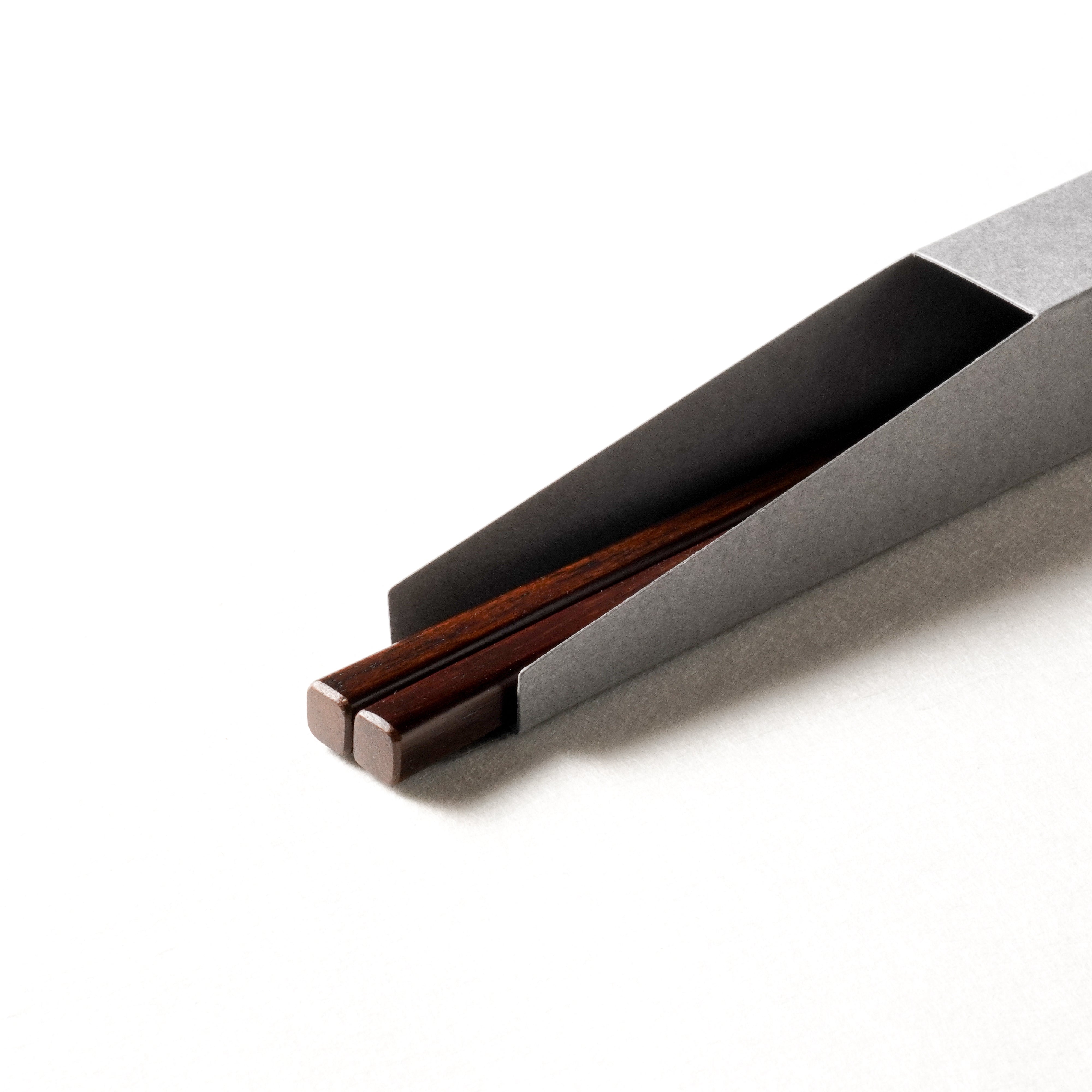 機能性と繊細さを両立させるため、箸の形状にこだわりました。木地に鉄刀木(タガヤサン)と呼ばれる堅い木を使用し、箸先まで細く丁寧に削られています。木の程よい重みと四角い形状で安定して持つことができ、箸先に力を加えやすい均整の取れた形です。