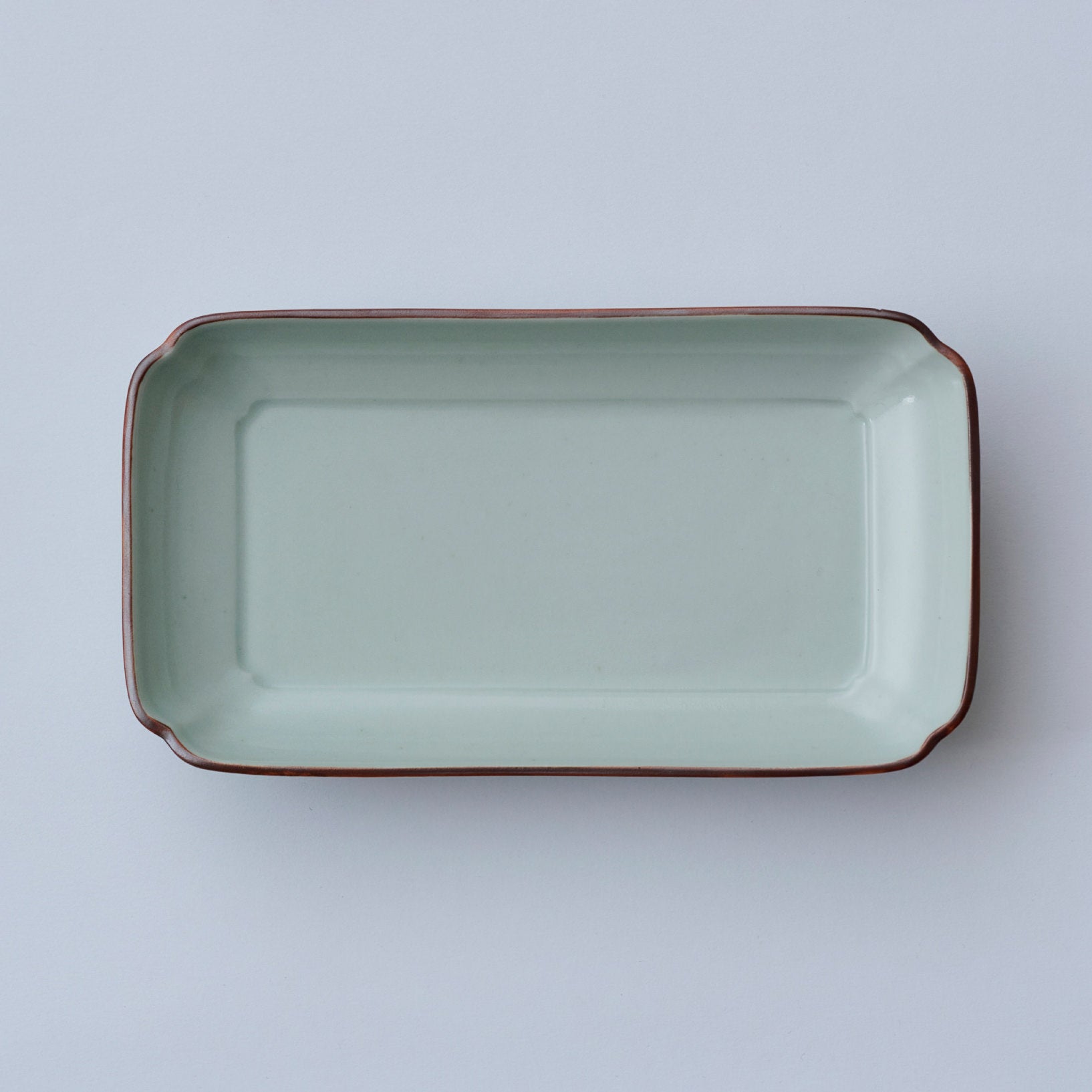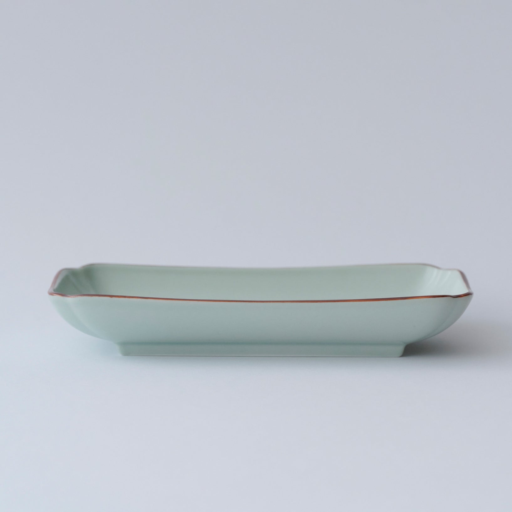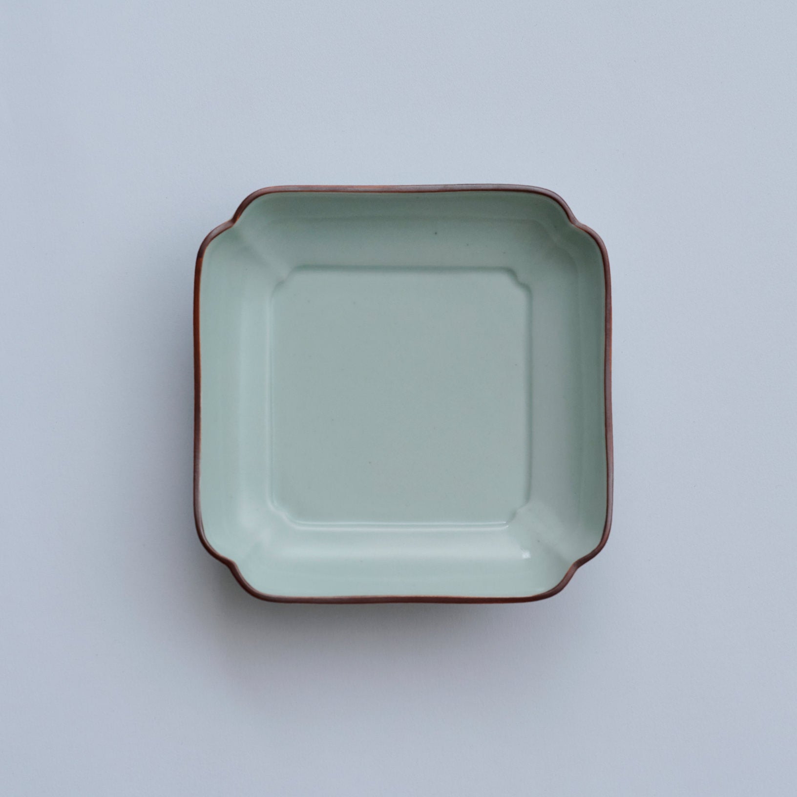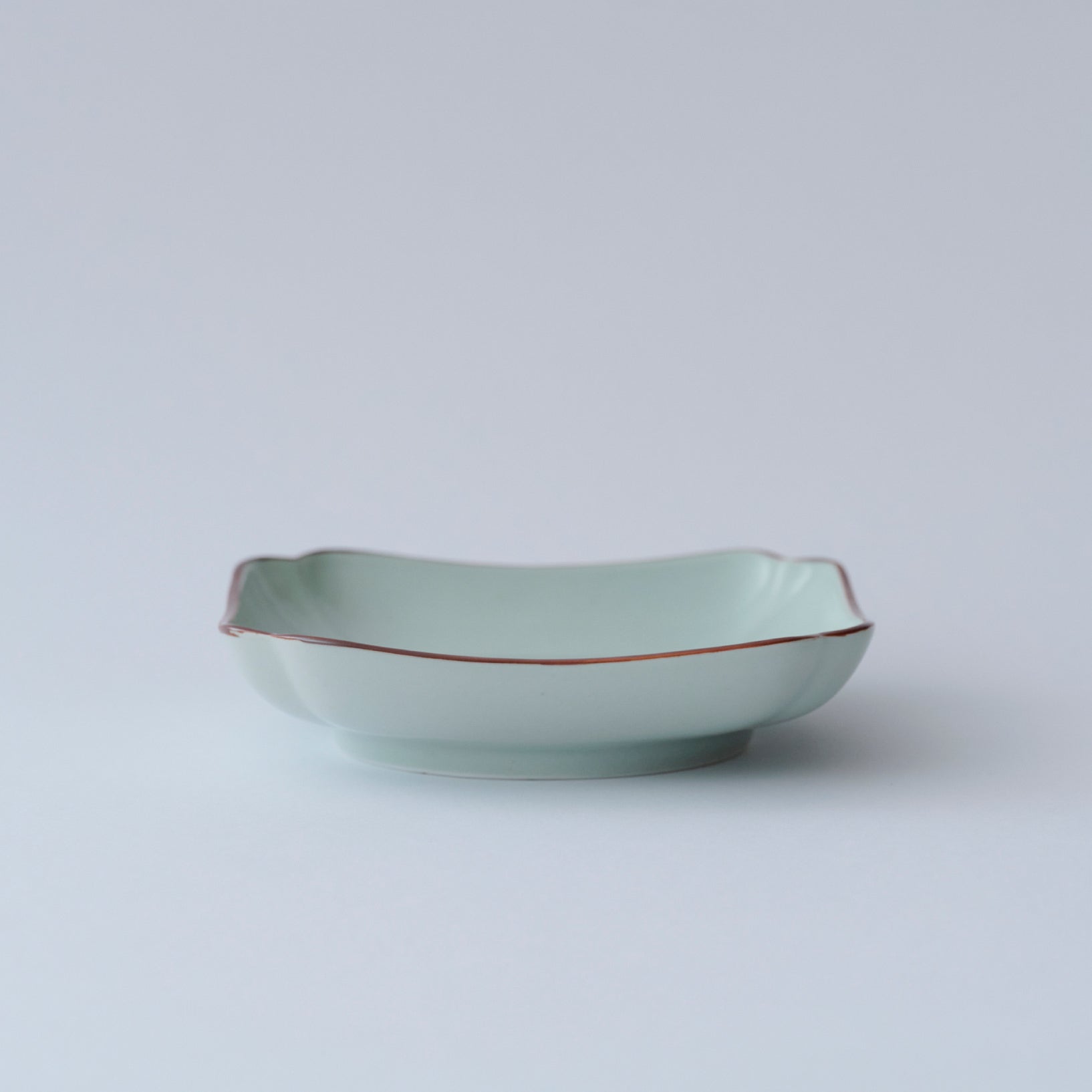 限りなく四角に近い木瓜皿(もっこうざら)。木瓜(ぼけ)の花びらのような形が一般的な木瓜皿に比べ、緩やかな曲線がシャープな印象を与えます。四隅の窪みが木瓜皿の名残を留め、懐かしさとモダンさを共存させる意匠のポイントになっています。