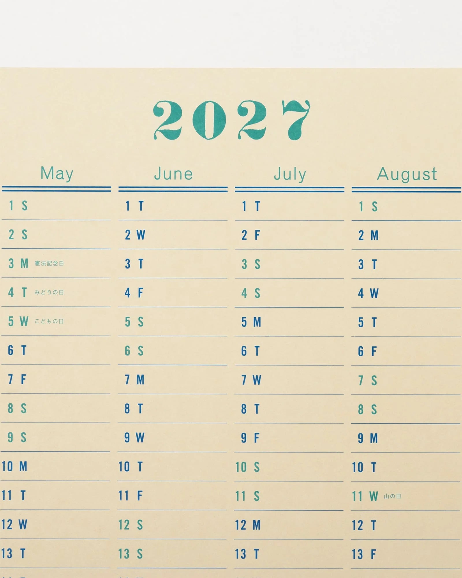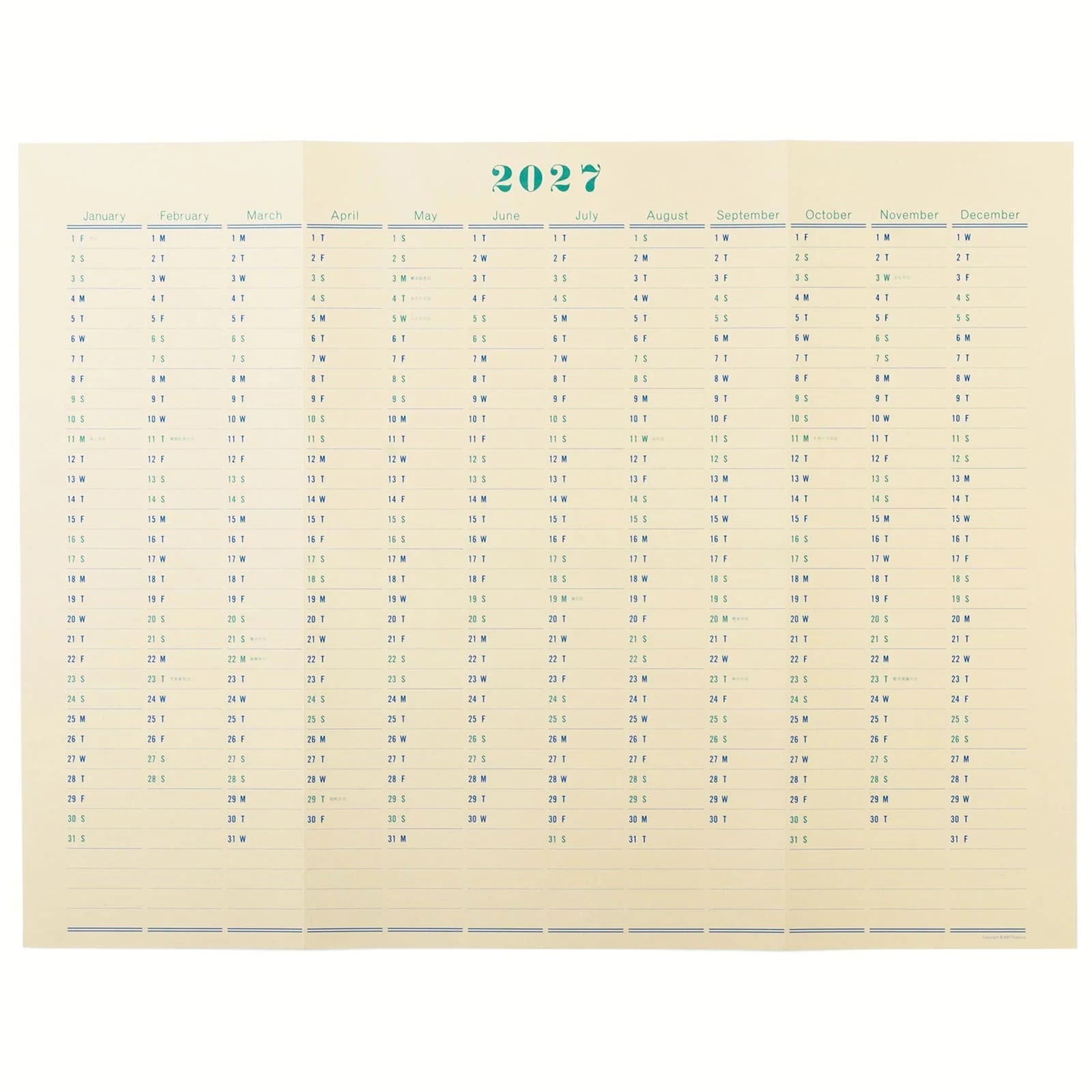 A calendar that allows you to see the year at a bird's-eye view. The textured paper and soft colored ink create a design that is easy on the eyes. There is a column for writing your schedule for each day, and there is also a space at the bottom of each month to write notes. It is easy to put it on the wall with tape or tacks. It can also be folded and carried. All Japanese holidays shown.