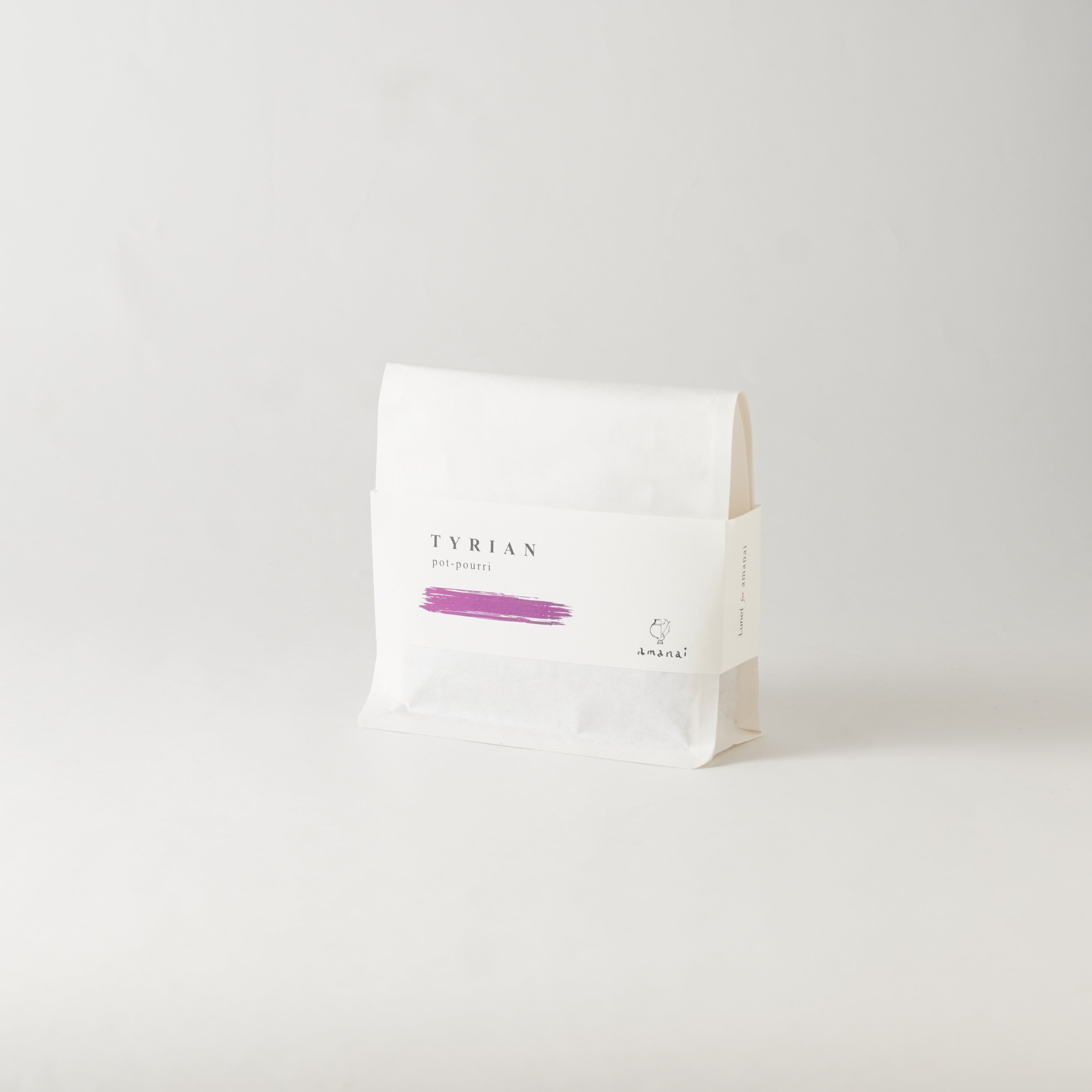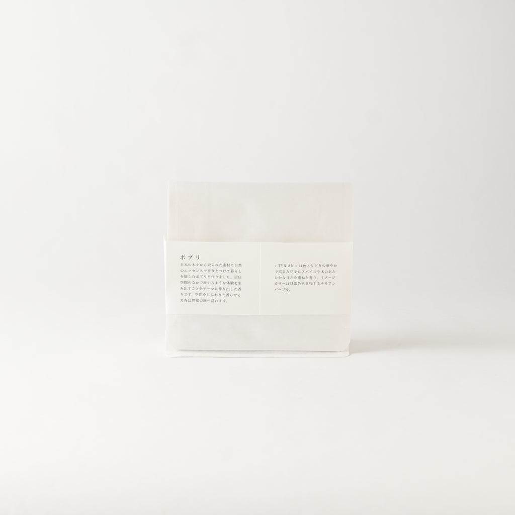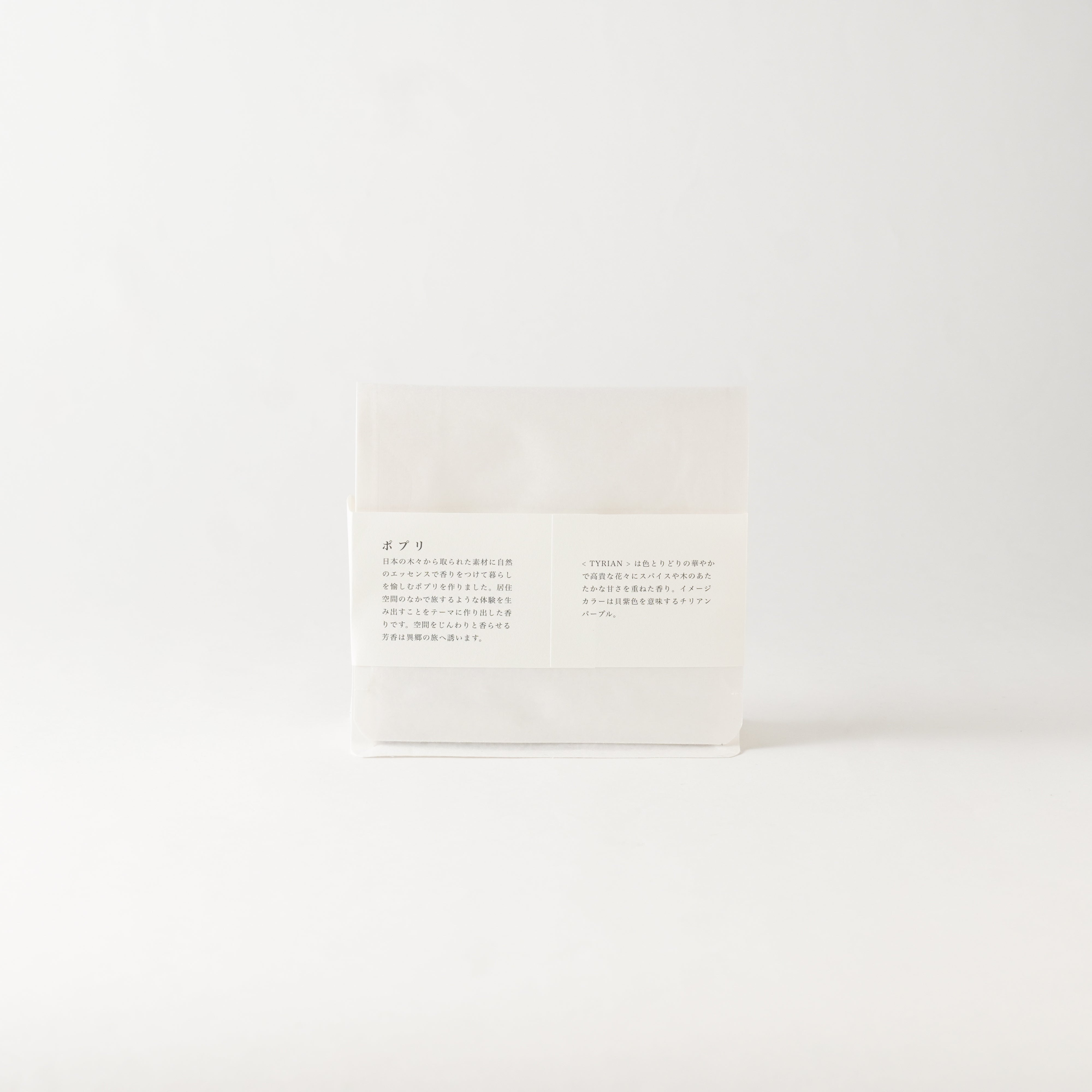 「Tyrian」は色とりどりの華やかで高貴な花々にスパイスや木のあたたかな甘さを重ねた香り。イメージカラーは貝紫色を意味するティリアンパープル。貝の染料が産出された地中海の古代都市「ティルス」に由来する澄んだ赤みのある紫です。海を渡った紫が日本の自然と出会ったような、折衷の趣きが空間に広がります。
