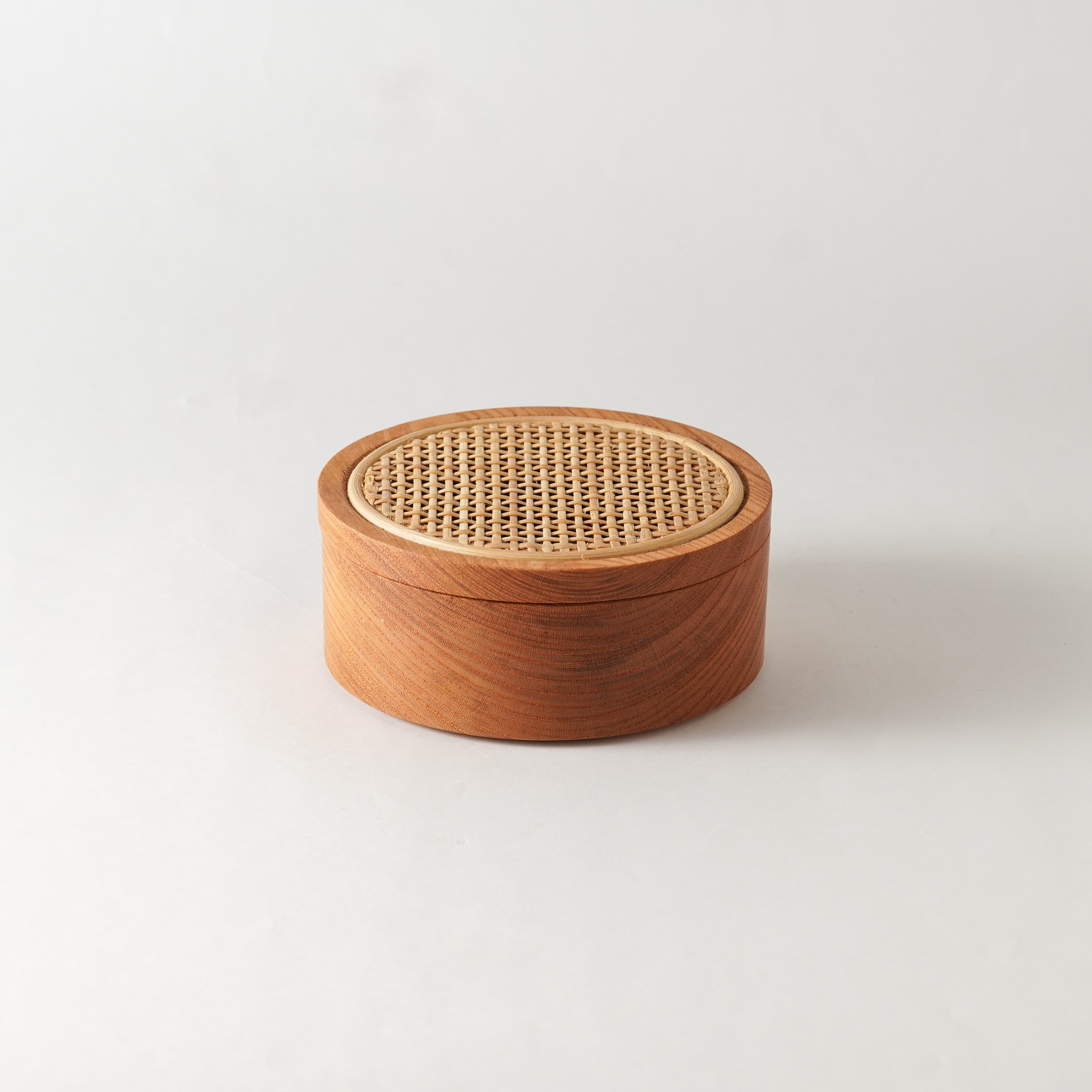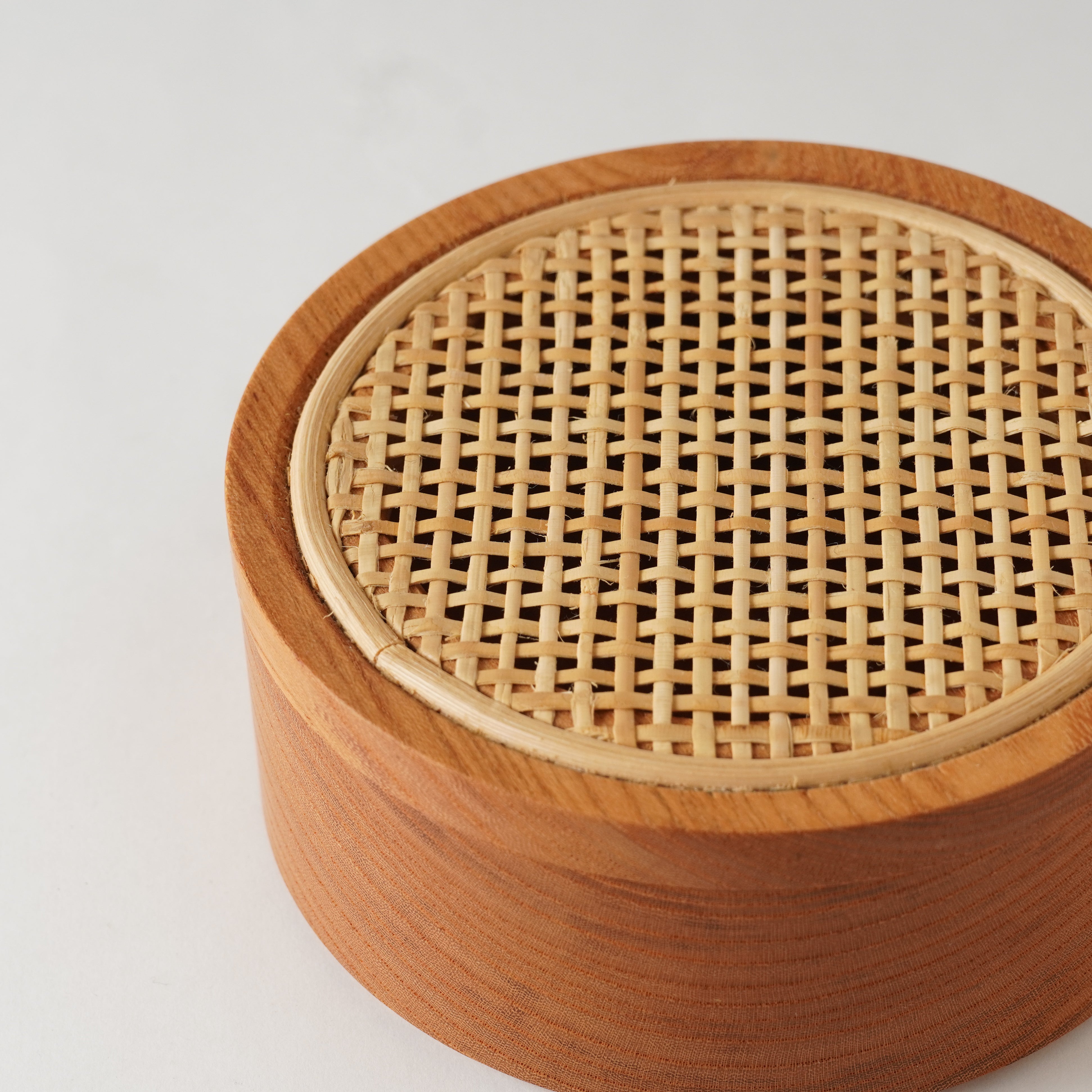 籐編みの蓋が目を引く円形のケース。ポプリを入れて香りをお愉しみいただけます。