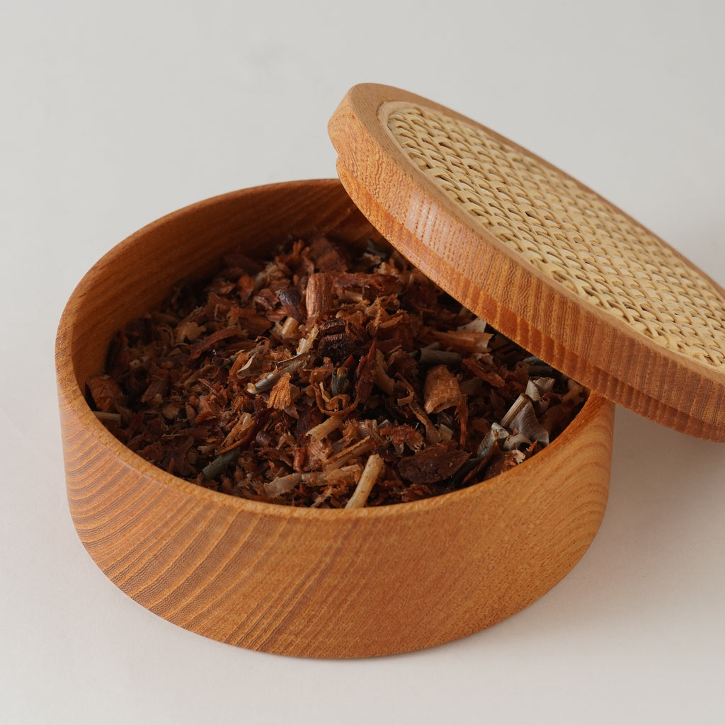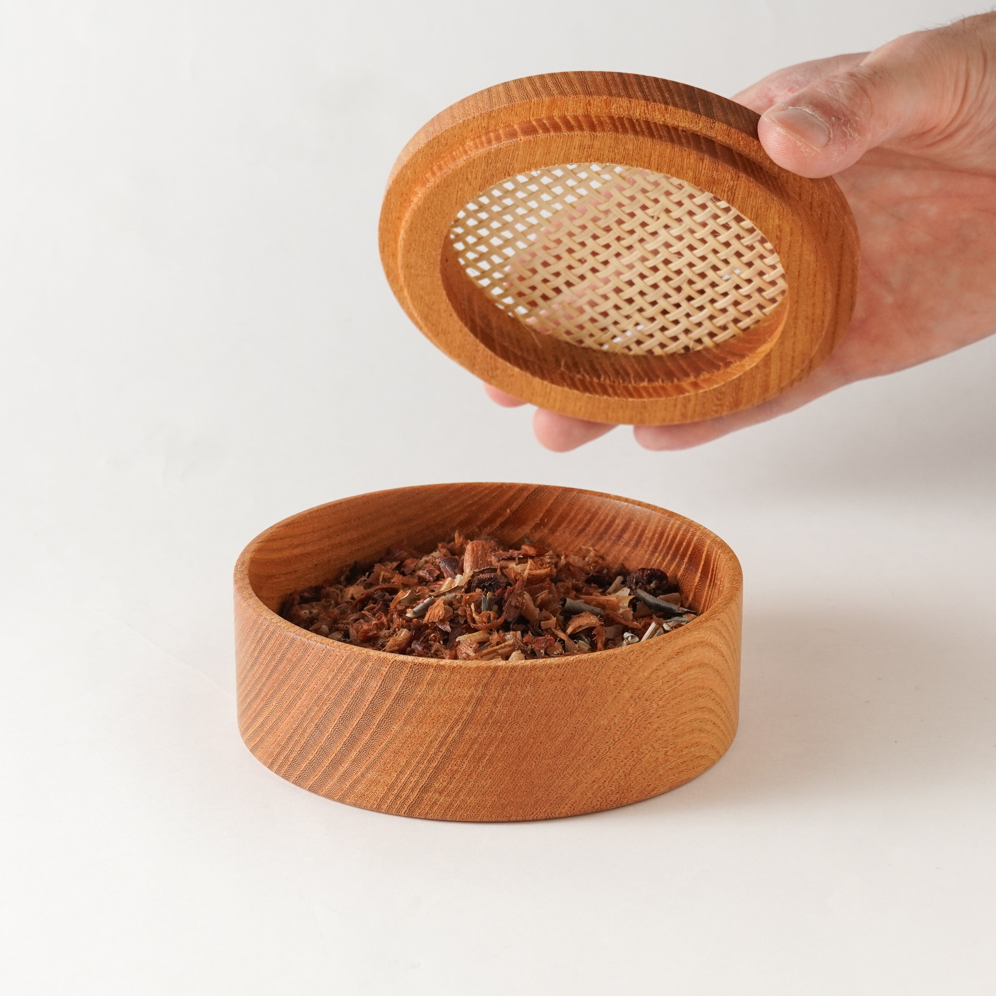 蓋を閉じた状態でも籐の編み目からほのかに香りが立ち上がり、開けるとより香りが広がります。空間やお部屋のインテリアに馴染む道具と家具を調和させたような意匠が特徴です。ガラス塗料の仕上げを施しているため、ドライとウェットどちらのポプリもお使いいただけます。