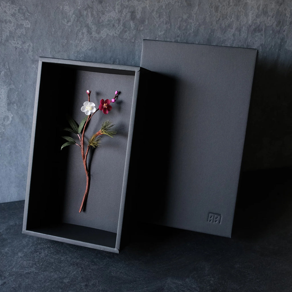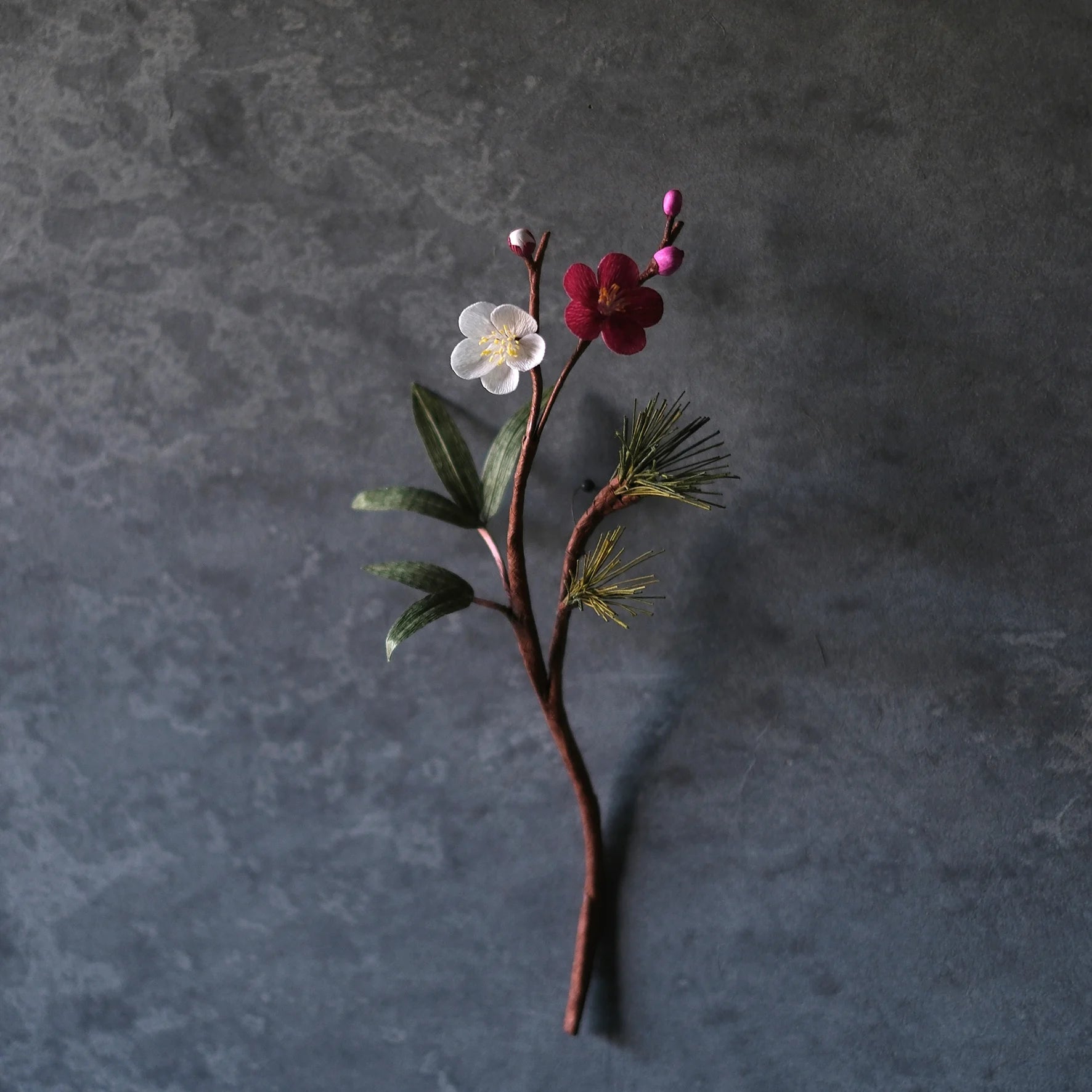 紙で創られたお正月の一輪。 縁起の良い松竹梅の花を一本の存在しない枝として制作しました。 松竹梅は「幸福・長寿・繁栄」を象徴する三つの吉祥として、お正月には欠かせません。 お正月が終われば、付属の紙箱にしまって毎年お使いいただけます。
