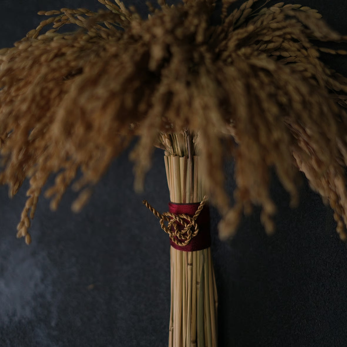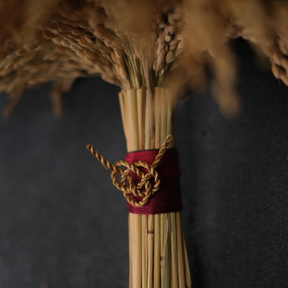 「雨」のお正月飾り。約100本の稲穂を使用し、たわわに実った稲穂を表現しています。 <黄金の草>で制作した淡路結びがポイント。ブラジルの一部の地域にしか自生しない黄金の草を結びの部分に使用して、自然の金色の輝きを放っています。(一部補強の為に金色の糸が使用されています)